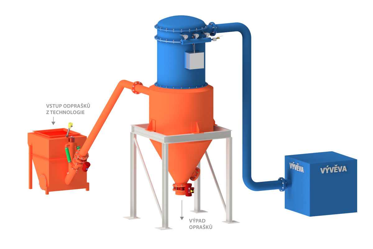 Systém podtlakové pneumatické dopravy pro bezprašný odsun odprašků VACU-TECH slouží pro dopravu sypkých odprašků a jiných práškových materiálů od výsypek průmyslových filtrů, kde plně nahradí ruční vysypávání odprašků z kontejnerů.